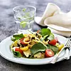Mixa mandel, apelsinskal och -saft och olja till en jämn massa. Smaka av med salt och peppar och blanda med pastan. Lägg på köttet och vänd i spenat och halverade tomater.