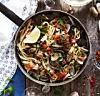Vänd försiktigt ner den nykokta pastan i musselgrytan. Pressa över citron. Peppra och toppa med persiljan.