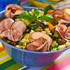 Skiva paprikan och blanda ner i salladen tillsammans med svarta oliver, tärnad ost, salladsblad. Lägg rosor av skinka överst och krydda med svartpeppar från kvarn och några basilikablad.