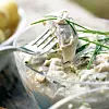 Blanda senap, pepparrot, socker, vinäger och olja. Vänd ner crème fraiche, gräslök och peppar. Tillsätt sillen och vänd runt i såsen så den blandas väl.