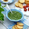 Mixa basilika och vitlök. Tillsätt pinjenötter, olja och parmesanost och kör tills allt blivit sönderhackat. Smaka av med salt och peppar.