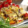 Vispa ihop ägg, grädde, mjölk, pesto, salt och peppar och häll över. Grädda i 40 minuter. Servera varm eller ljummen uppskuren i rutor.