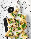 Grädda pizzan tills den är gyllene och frasig, cirka 15 minuter. Strö över basilika och servera skuren i små snibbar.