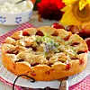 Häll smeten i en smord form, 24 cm i diameter. Dela plommonen och ta bort kärnan. Lägg dem med kupiga sidan upp i smeten. Strö över socker och mandelspån.