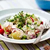 Plocka isär salladsbladen och lägg i botten på en skål eller på ett fat. Lägg på potatissalladen och strö över krasse.