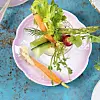 Skala morötterna. Skär sellerin och gurkan i stavar. Plocka bort det mesta av blasten på rädisorna, men lämna några blad som garnering. Ansa och skär fänkålen i klyftor. Bryt av den hårda