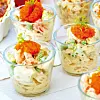 Vispa grädden och rör ner resten av ingredienserna till såsen. Smaka av. Rör ner såsen i räkröran.