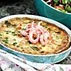Äggstanning: Vispa samman ägg, grädde, dill, salt och peppar och häll i pajformen. Grädda i nedre delen av ugnen i ca 25 minuter. Garnera med räkor och servera med sallad.