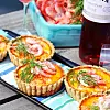 Fyllning: Skiva salladslöken och fräs den mjuk i en stekpanna med olja, ca 3 minuter. Fördela i pajskalen. Strö över ost. Skala räkorna och spara, 24–30 stycken till garnering. Lägg resten i pajskalen.