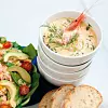Vispa i räkost och kokosmjölk, och hetta upp soppan. Smaka av med salt, peppar och kajennpeppar. Rör i dill och räkor. Servera med bröd.