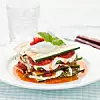 Varva sedan tomatröra, pesto, cashew-creme fraiche, squash och tomatskivor i tre lager,