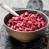 Halvera, skala och fintärna löken. Tärna rödbetor och oskalade äpplen fint. Vänd ner alla tärningssorterna i såsen. Förvaras kallt, högst en vecka.