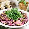 Du behöver Dressing: 1 tsk sötstark senap 1 msk ättiksprit 3 msk olja salt och peppar Garnera med: rucolasallad Gör så här 1 Blötlägg russinen...