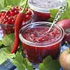 Lägg sköljda vinbär, äpplen, lök, vitlök, tomater, chili, vinäger, socker, senapsfrö, salt och peppar i en gryta och koka sakta, ca 30 minuter. Smaka av om det behövs mer salt och peppar.
