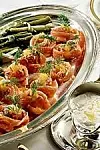 Du behöver Rökt lax med skaldjurssymfoni: lax ca 1 kg rökt i tunna skivor räkor ca 500 g med skal 1 st kräftstjärtar i lag...