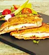 Bulta skivorna så att de blir stora och tunna. Salta och peppra. Placera skinka och ost på varje halva, vik den andra halvan över.