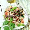 Sallad: Skölj bönorna och låt rinna av. Skär tomaterna i mindre bitar. Blanda bönor, tomater, dressing och basilikablad.