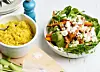 Dela avokadon på mitten och ta loss kärnan, skär i mindre bitar. Plocka loss salladsbladen, skölj i kallt vatten och skär i mindre bitar. Lägg upp morötter, sallad och avokado på ett fat eller i en skål. Toppa med fetaost, mynta och ärtskott. Ringla över citronsaft.