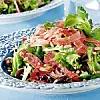 Strimla salami och skinka. Lägg salladen i en bunke, vänd ihop med olivolja, vinäger, senap, salt och svartpeppar.