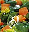 Fördela bladen på ett fat. Skala moroten och hyvla i långa band. Skala och skär löken i ringar. Lägg morotsbanden liksom silverlöksringarna på salladen. Strö över rikligt med svarta oliver.