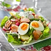 Skölj och skiva rädisorna. Skölj salladen och skölj och skiva gurkan. Lägg upp allt på ett fat. Skala och dela äggen och lägg på salladen.