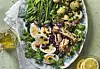 Lägg upp potatis, haricots verts, tonfisk och ägghalvor på en bädd av sallad, på ett serveringsfat. Toppa med kapris och oliver.