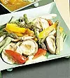 Halvera svamparna och grilla dem mjuka. Grilla sparris och lök. Blanda allt och droppa över olja. Salta och peppra.