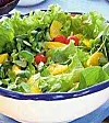 Skölj salladerna och varva dem i en stor skål med solrosskott och tomater. Skala och klyfta apelsin och rödlök och blanda i.