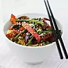 Vänd ihop de kokta nudlarna med grönsaker och sojasås. Smaka av med salt och peppar. Strö över sesamfrön.