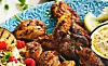 Kycklingspetten får sällskap av flera goda tillbehör. Om du inte får tag i libabröd är bulgur eller couscous också gott att servera till.