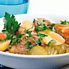 Häll över öl och kalvfond. Salta och peppra. Låt grytan sjuda, ca 15 minuter tills potatis och morötter är mjuka. Smaka av och strö över hackad persilja.