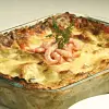 Tillaga lasagnen i mitten av ugnen, ca 30 minuter. Garnera eventuellt med räkor och dill. Servera med sallad.