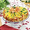 Tärna paprikorna fint och blanda dem. Skala och skär mango och kiwifrukter i tunna klyftor. Krama den mesta vätskan ur kräftstjärtarna. Bred majonnäsen runtom och över tårtan. Tryck fast paprikan runtom kanten. Garnera med mango, kiwi och kräftstjärtar. Strö lite färska örter över.