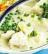 Värm upp såsen i en kastrull. Lägg i fiskbitarna och ärterna. Koka upp igen och sjud fisken på svag värme cirka 5 minuter tills bitarna nätt och jämnt är fasta och vita rakt igenom. Skaka på kastrullen, rör inte. Smaka av med salt och peppar och strö på rivet citronskal vid servering.