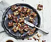 Häll i chokladsmeten och toppa med resten av nötterna och mandeln, ställ att stelna. Skär upp i bitar och servera till nybryggt kaffe.