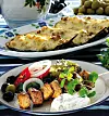 Mycket omtyckta grillspett där du kan välj lamm- eller fläskkött. Tzatziki (gurk- och vitlökssås är obligatoriskt till). Längst fram på bilden står Souvlaki med tzatziki. Bakom den syns även Moussaka.