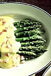 Lägg upp sparrisen på heta tallrikar, häll över sås och garnera med hackade rädisor. En skiva skinka är gott till, liksom bröd att bryta.