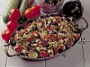 Smula osten och strö den över det hela. Strö på smulad oregano och oliver. Droppa olivoljan över det hela.