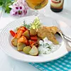 Citron- och dillsås: Smält smöret i en kastrull. Rör i mjöl och späd med vatten, grädde och buljongtärning. Koka i 5 minuter. Smaka av med pressad citron, dill, salt och peppar. Servera fisken med sås och ugnsbakade potatisar, morötter och paprika.