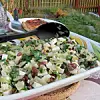 Skala och hacka löken fint. Hacka oliverna och strimla kirskålen grovt. Fräs snabbt lök och kirskål i lite olja, så de blir mjuka. Låt svalna.