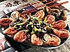 Häll ketchup, vin och buljong i woken, låt koka ihop 2 minuter. Skeda såsen över räkorna på fatet, garnera med svampen.