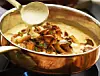 När det fått fin färg pudra över lite vetemjöl och slå på kantarellfond och grädde.