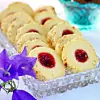 Skär i 1 cm tjocka skivor och lägg dem på en plåt med bakplåtspapper. Gör en fördjupning mitt i varje kaka och fyll med sylt. Grädda mitt i ugnen i 15 minuter. Låt kallna.