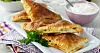 Rulla ut degen från pizzakittet. Skär degen i 8 lika stora fyrkanter och lägg en klick färs på varje platta. Pensla kanterna med uppvispat ägg och vik ihop till trekanter. Tryck till kanterna med en gaffel.
