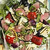 Varva grönsaker, kött och rucola på ett fat. Ringla över jungfruoljan. Salta och toppa med flagad parmesan. Servera med balsamvinäger och grillad baguette.