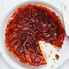 Ta ut, lägg ett stort fat över pajformen och vänd upp och ner på alltihop så att tarten hamnar på fatet med äppellagret i topp. Använd bra grytvantar och var försiktig, det är lätt att bränna sig. Vänd upp kakan bums så att den inte fastnar.