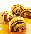 Kavla ut degen till en rektangel (25 x 30 centimeter). Fördela moset över degplattan. Rulla ihop (som en rulltårta). Skär i tjocka skivor. Placera på bakplåtspapper och grädda i 225 graders ugnsvärme cirka 10 minuter. Servera dem gärna varma.