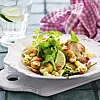 Skiva bananen och stek gyllene i en stekpanna med olja. Blanda kött, nudlar, bananskivor och sallad. Strö över cashewnötter och servera med limeklyftor.