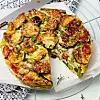 Täck en form med löstagbar kant (cirka 22–24 centimeter i diameter) med bakplåtspapper i botten. Varva sparris med squash, tomat, lök och franska örter och krydda med salt och peppar. Tillsätt ett tunt lager riven ost mellan varven.