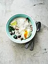 Servera soppan med risnudlar, ägg och lime­klyftor.